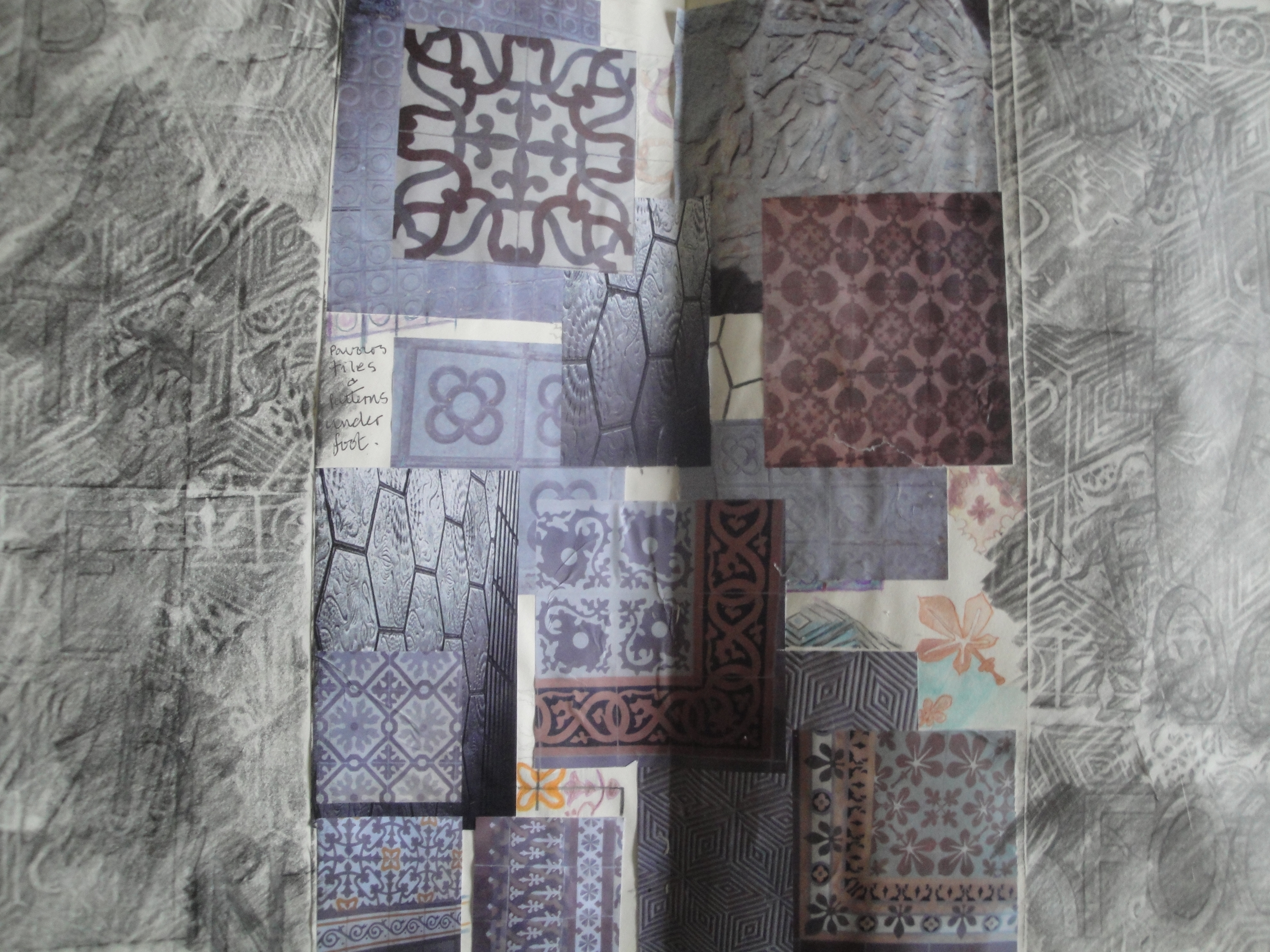6. Above and below. Cleaned collagraph boards combined with concrete to make ’tiles’ that suggest dappled leafy shadows on the ground and develop the brutalist concrete overprinting ideas in a 3D format.